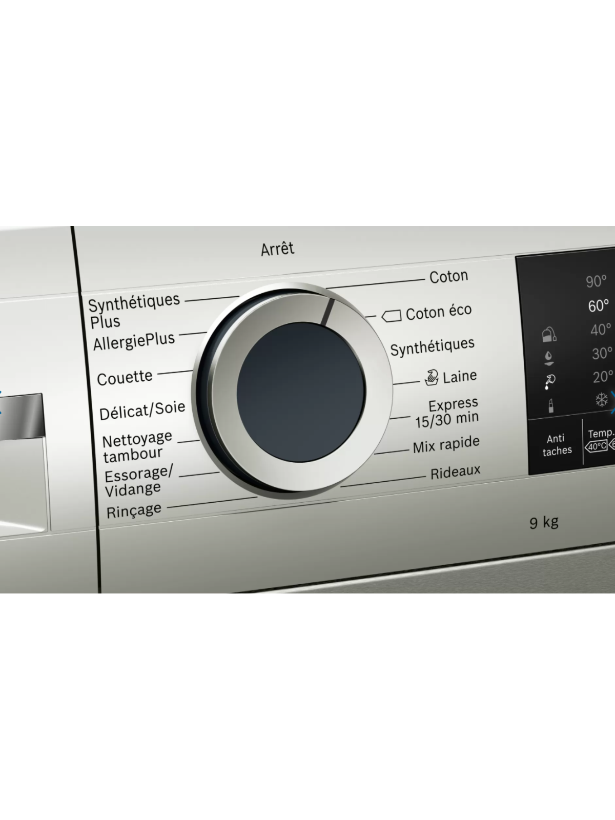 | Optimisation du lavage | Allergie+/Hygiene, Départ/Pause, Edredon, Nettoyage tambour, rapide/mix, Repassage facile, Sélection de la température, Sélection taches, simple rinçage, SpeedPerfect, Super 15 min / Super 30 min, Terminé, vidange / essorer, Vitesse d'essorage au choix, voilages 30°C |
