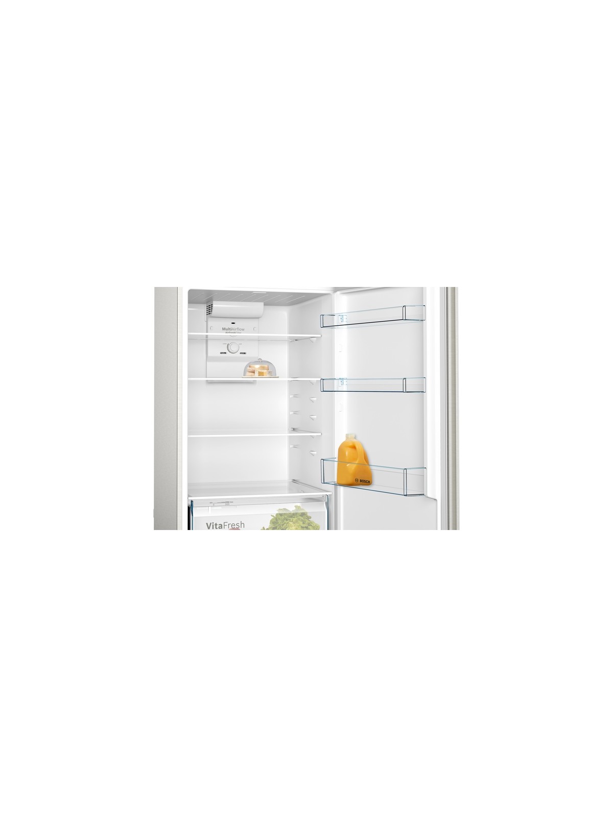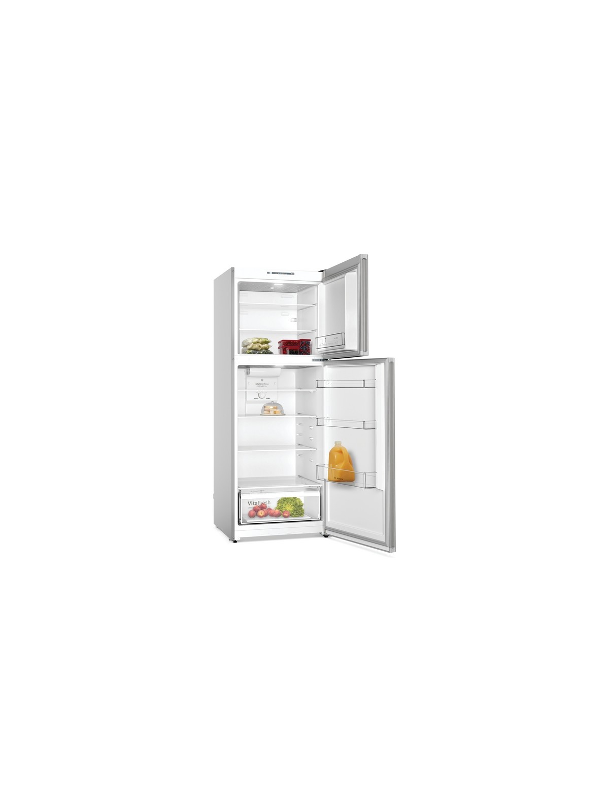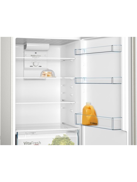 Réfrigérateur BOSCH XXL - 2 Portes - Système de refroidissement: NoFrost - Volume Brut total: 485 Litres - Volume net total: 453 Litres - Capacité Brut réfrigérateur: 338 Litres - Capacité Brut congélateur: 147 Litres - Classe énergétique: A+ - Consommation annuelle: 378 kw/an - Autonomie : 17h - Eclairage LED - Système Multi Airflow - SuperFreezing - EcoMode - supports à oeufs - Dimensions: H x L x P: 186 x 70 x 74.5 mm - Poids: 76.4 kg - Couleur: Inox - Garantie: 2 ans