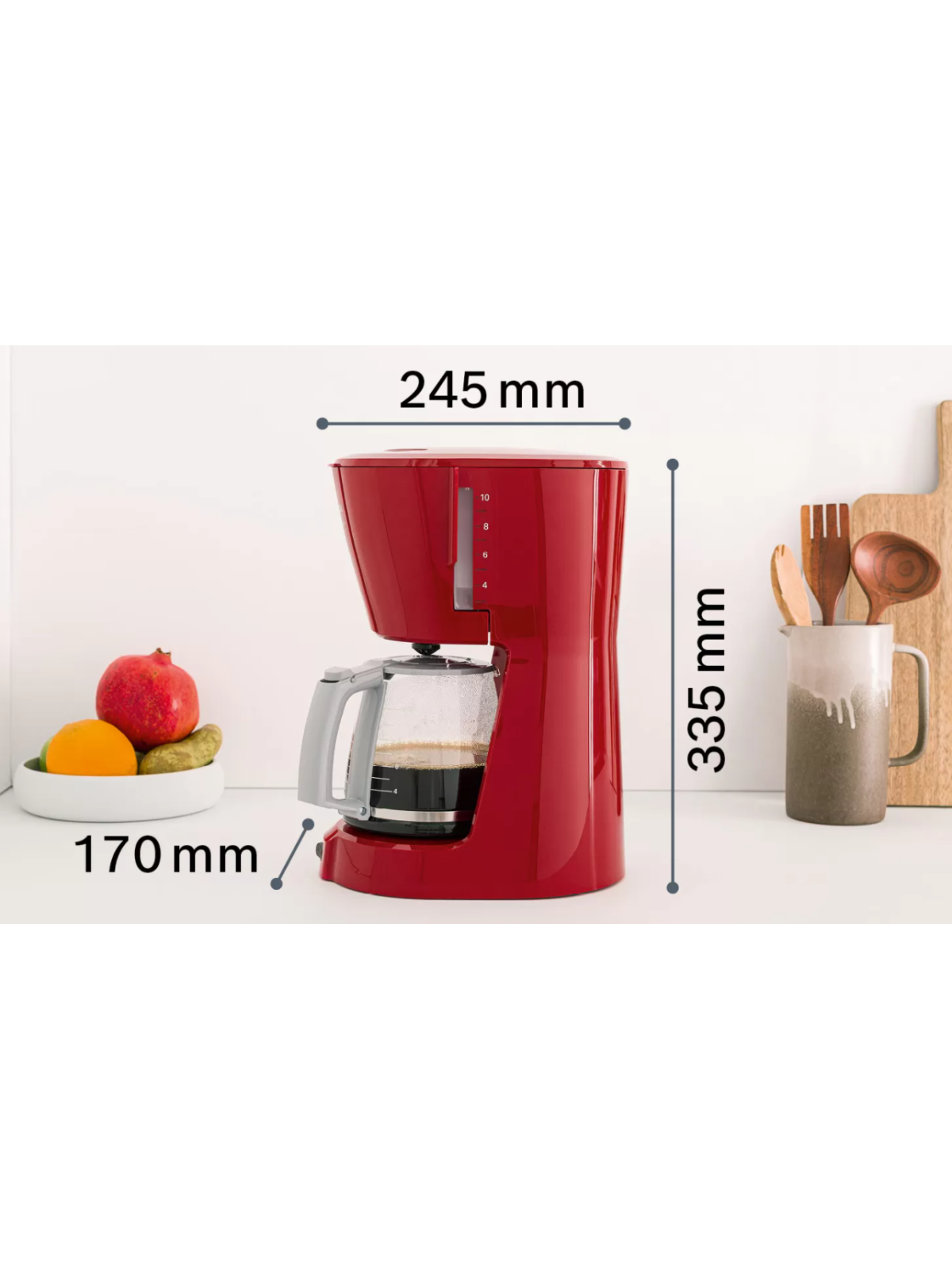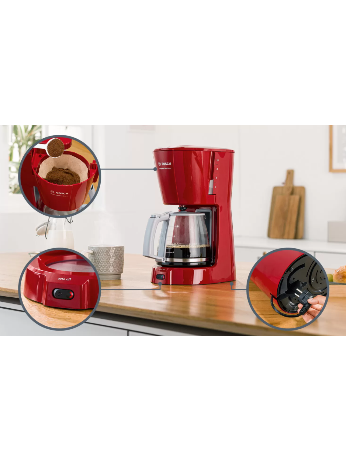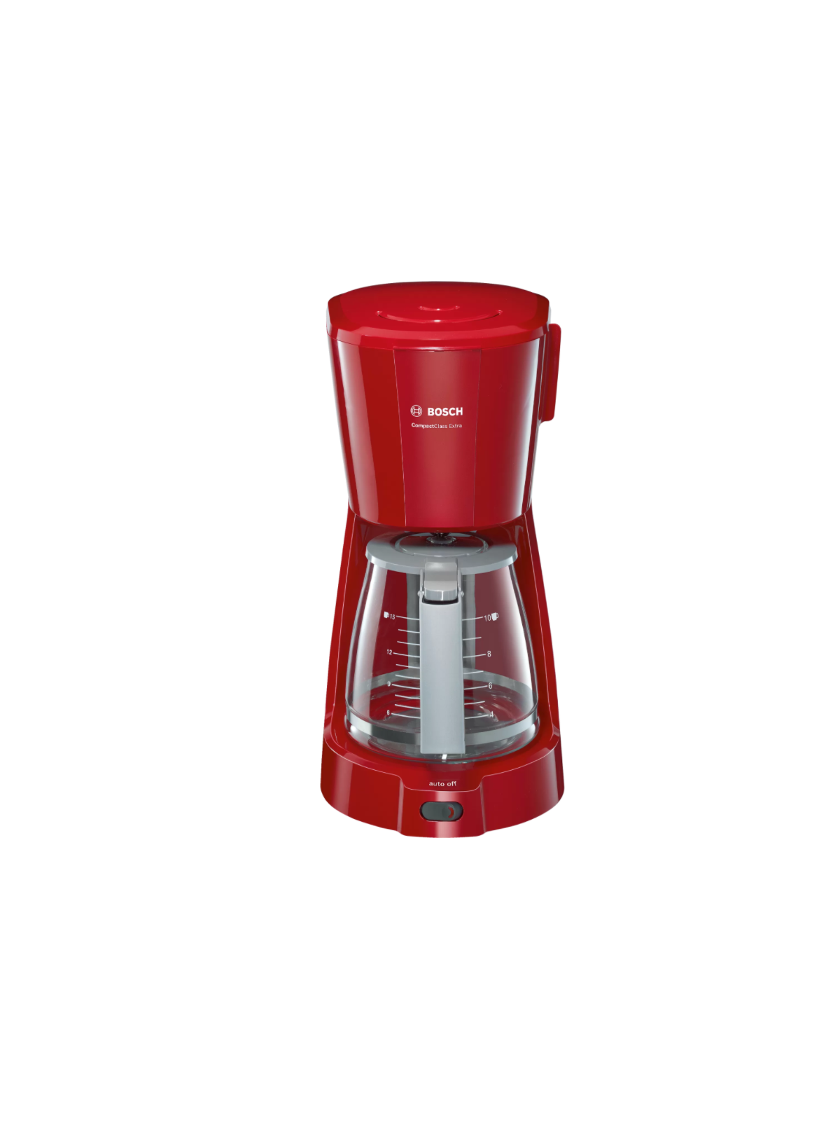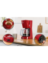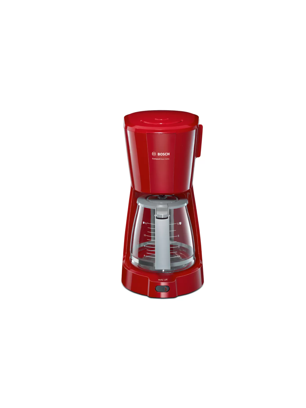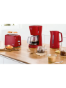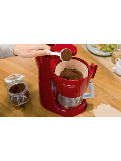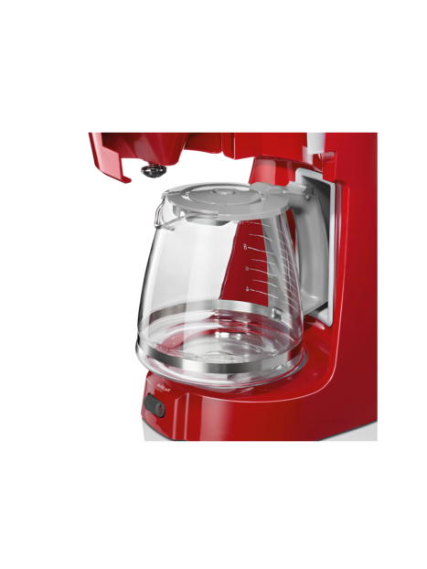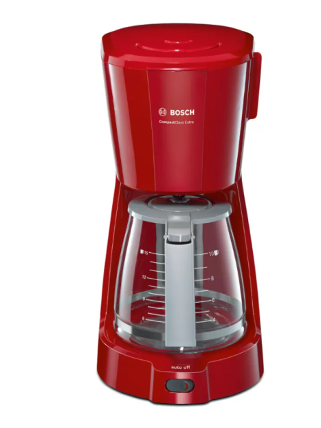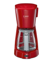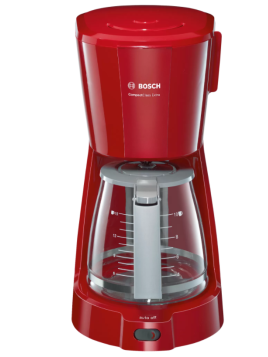 Cafetière Electrique BOSCH - Puissance: 1100W - Capacité: 1.25 L - De 10 à 15 Tasses - Porte-filtre pivotant - Système anti-gouttes - Témoin lumineux de mise en marche - Réservoir translucide et amovible avec poignée et indicateur du niveau d'eau - Arrêt automatique - Pieds antidérapants - Dimensions: 335 x 170 x 245 mm - Couleur: Rouge - Garantie: 1an