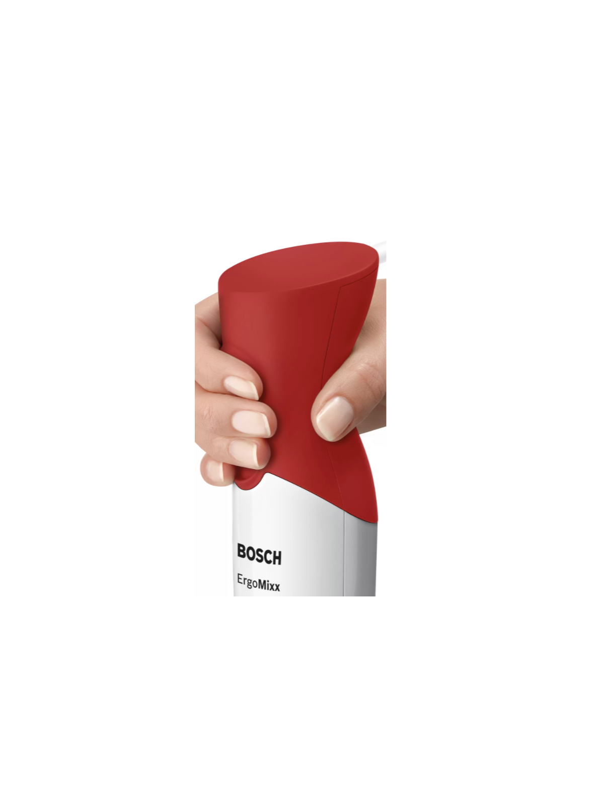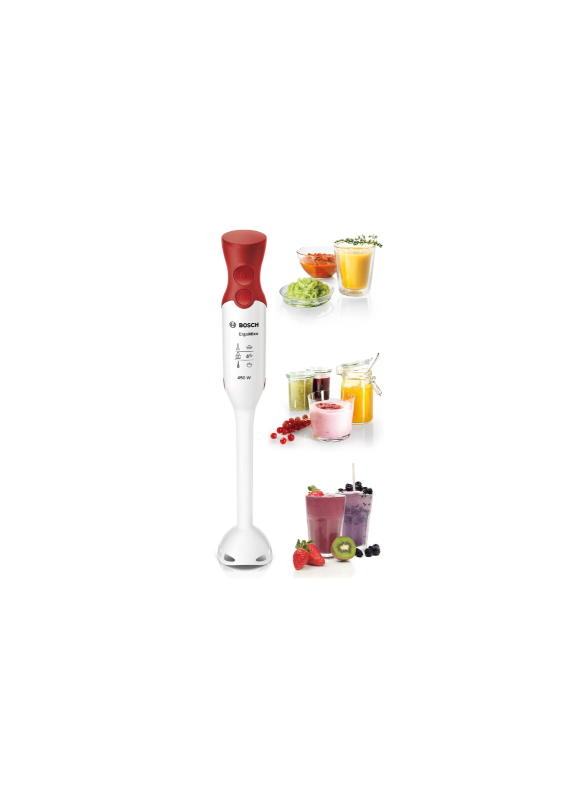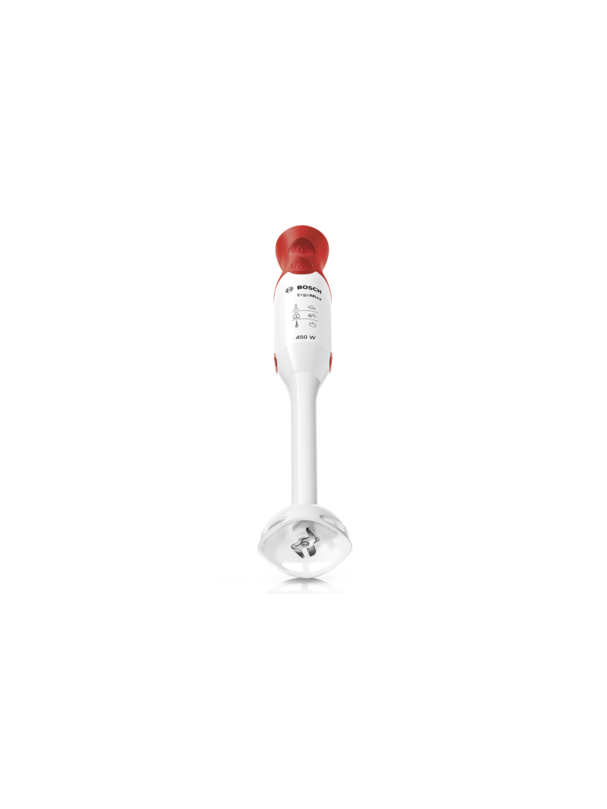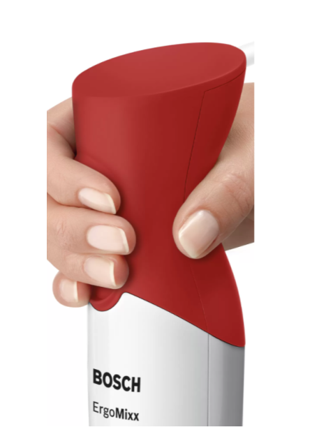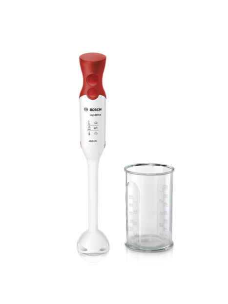 Mixeur Plongeant BOSCH ErgoMixx - Puissance: 450 watts - 2 Vitesses - Forme ergonomique - Prise en main facile - Pieds en Plastique - Résistant à la chaleur - Sans BPA- 4 lames en acier inoxydable - Moteur silencieux sans vibrations - Fixation sécurisée du pied mélangeur grâce au mécanisme de "clic" audible - Poids: 0.9 kg - Couleur: Blanc et Rouge - Garantie: 1 an