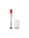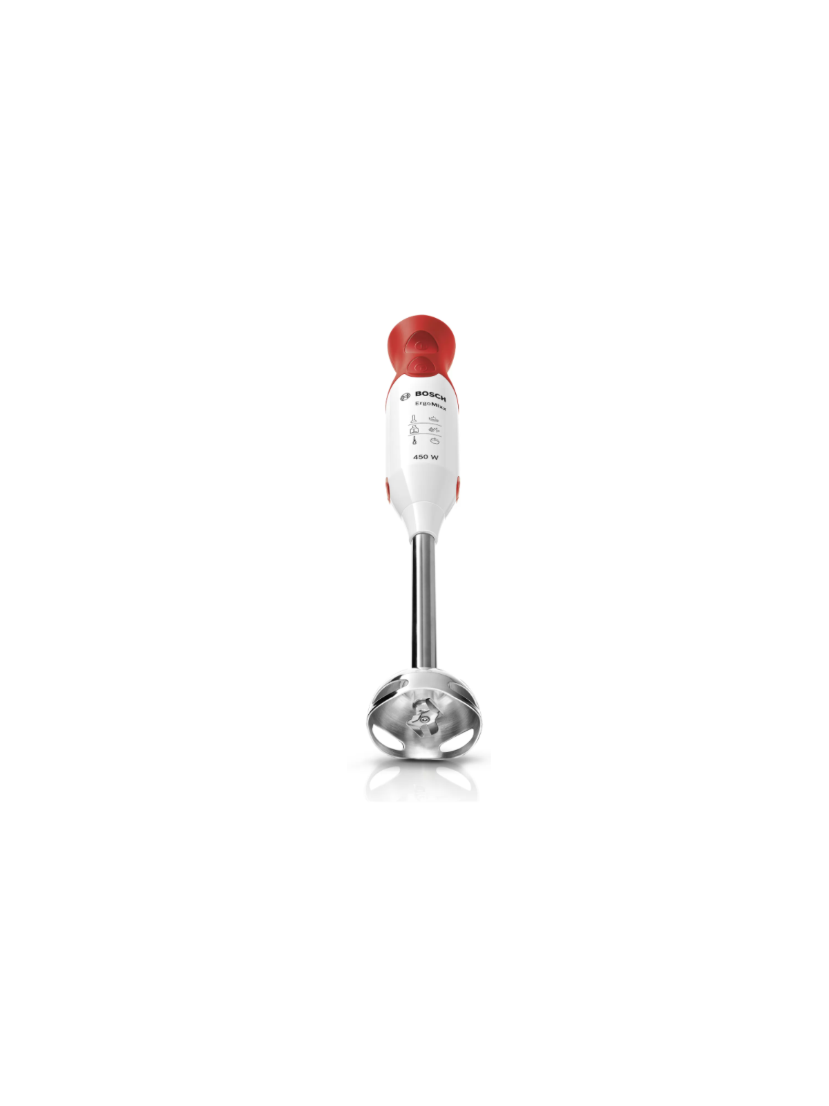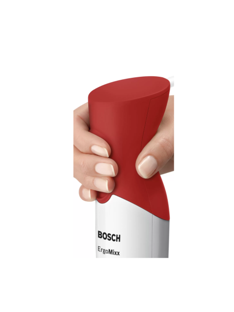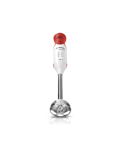Mixeur Plongeant BOSCH- Puissance: 450 W - Nombre de vitesse: 2- Capacité de Bol: 600 mL- Pied mixeur inox - Touche turbo - 4 Lames inox aiguisées pour des préparations onctueuses et homogènes - Poignée ergonomique et son revêtement soft-touch - Dimensions: 39.3 x 5.5 x 6.2 cm - Couleur: Blanc Et Rouge- Garantie: 2 ans